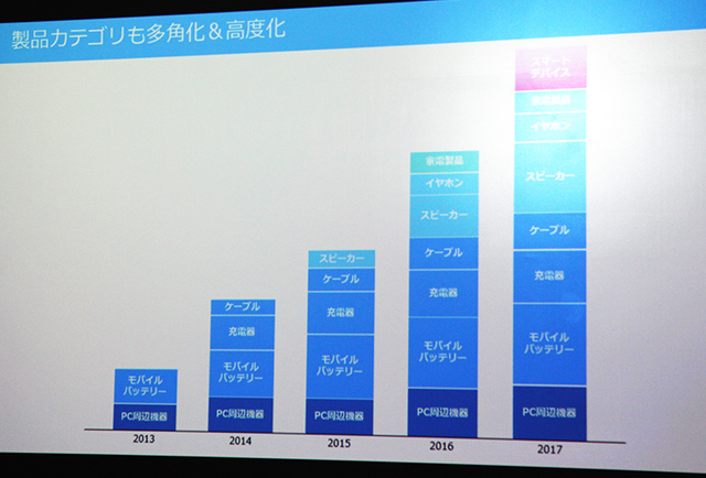 その後、スマートフォンの普及に伴ってモバイルバッテリーの需要も増加し、販売チャネルも拡大し、2017年の売上高は74億円まで増加。設立から5年間で約720%成長したという。井戸氏は「アンカー・ジャパンが“モバイルバッテリー”というジャンルを確立した」と語った。
