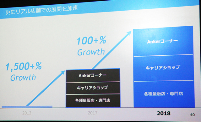 またリアル店舗での展開も強化。現在は各量販店・専門店、auなどキャリアショップなどで販売しており、2018年は特に家電量販店に注力を図っていくとのこと。「モバイルバッテリーやスピーカーは実店舗で購入するユーザーもまだ多い。実店舗での展開も広げることで、新規顧客の獲得、事業拡大を目指す」と説明。