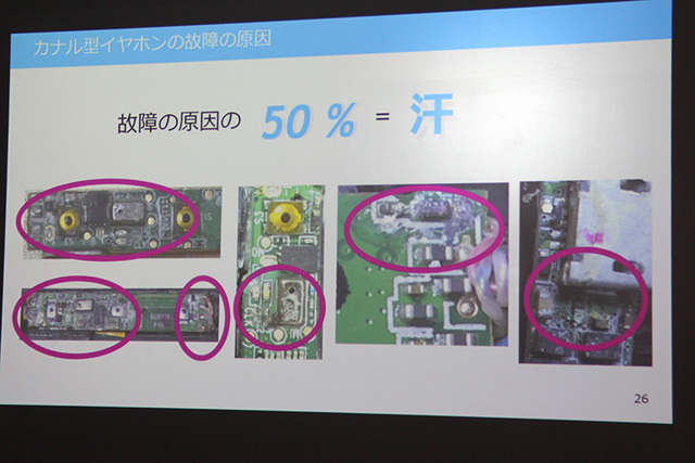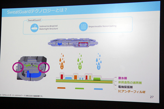 防水・防汗を実現する部分の構造は、下からICアンダーフィル材、電機保護層、非腐食性の遮断層、耐水層となっており、しかも内部にナノコーティングを施すことで、イヤホンのように変形した形状でも防汗対応できるようにした。