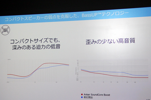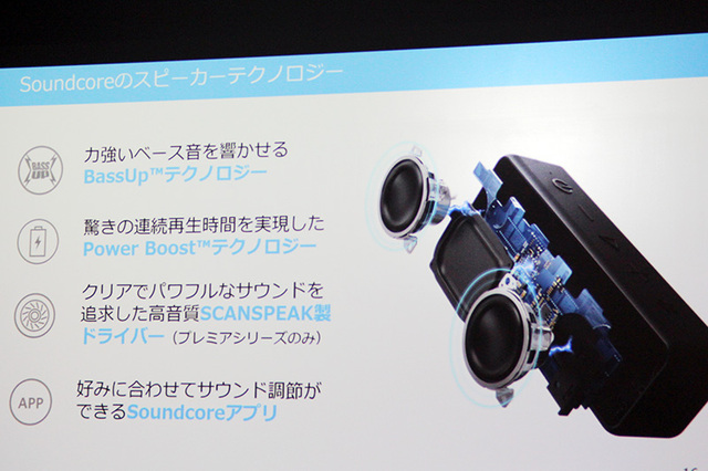同氏はまず、Soundcoreシリーズのスピーカーの特徴して、低音を強化する「BassUPテクノロジー」、連続再生時間を長くする「Power Boostテクノロジー」、プレミアシリーズにはSCANSPEAK(スキャンスピーク)製ドライバーが搭載されていること、さらにサウンドの調整を好みに応じて行える「Soundcoreアプリ」の4点を挙げた。