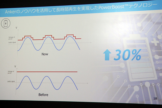 またPower Boostテクノロジーについては、音楽信号にわせて電圧を変動させることで、バッテリーの持続時間を延長。同技術を使用しない場合に比べ、30%以上のバッテリー持続時間アップが可能になるという。