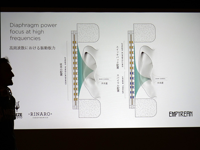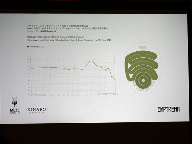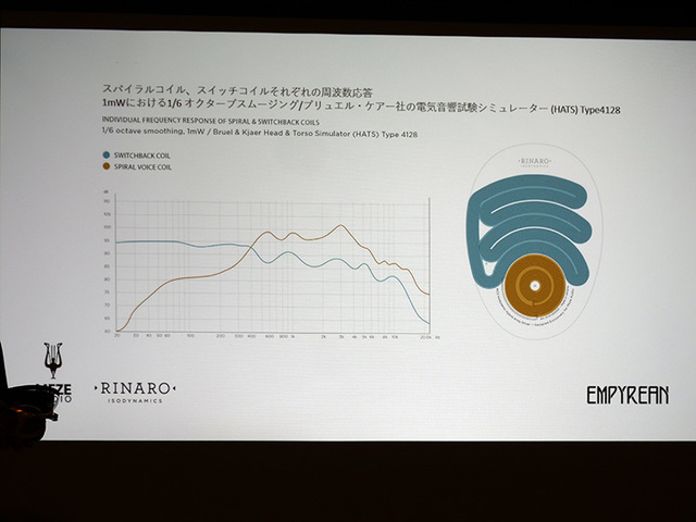 またスパイラルコイルを下に配置したのは、耳の位置と振動板の位置の関係から、高域を外耳道に直接入れるように配置したかったという思いもあるのだという。