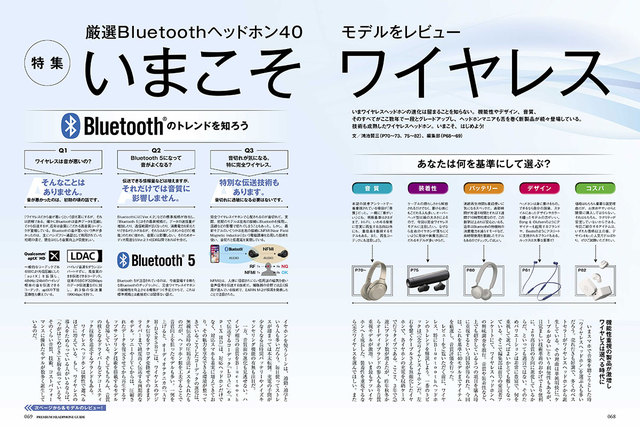 最近、ワイヤレスイヤホン・ヘッドホンが気になる・・・。そんな方も多いのではないでしょうか? 編集部は前号で読者アンケートを実施し、読者様が購入時に重視する項目が「音質」「装着性」「バッテリー」「デザイン」「コスパ」の5つであることに注目して、この5項目に沿った40モデルを厳選レビューしました。これを読めば本当に欲しいワイヤレスに出会えます!