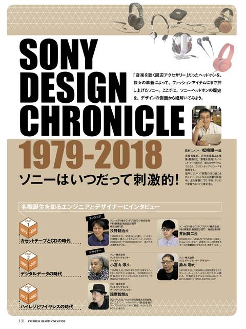 旬の製品を深く味わった後に、歴史をさかのぼる企画はいかがでしょうか? 今号では「SONY DESIGN CHRONICLE1979〜2018」と題し、ソニーヘッドホンの歴史をデザインの側面から紐解きました。「30年前は、オーディオ部署の隅っこで細々とつくっていた」というヘッドホンが一大カテゴリーに成長するまで、技術/デザインの両面でヘッドホンを牽引してきたソニー。家電蒐集家の松崎順一さんをコメンテーターにお迎えし、「MDR-3」「MDR-R10」など名機誕生を知るエンジニアとデザイナー5人に徹底取材!世界でここにしかない特集をお届けします。