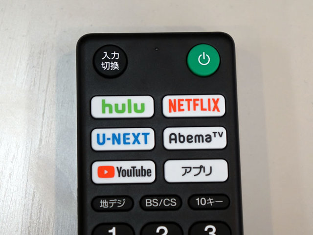 特に、Android 8.0ではアプリ一覧の画面が従来より小さくなり、サイドメニューの「Apps」アイコンを押下するとアプリ一覧ページに遷移するスタイルとなる。そのため、アプリ一覧画面を呼び出しやすいよう、新リモコンには「アプリ」ボタンを用意した。加えて、Hulu/Netflix/U-NEXT/Abema TV/YouTubeアプリをダイレクト起動できるボタンもそれぞれ備えている。
