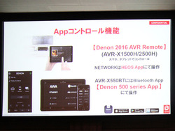 またこれも前述の通り、Bluetooth機能を内蔵。AM/FMラジオチューナーを備え、ワイドFMにも対応する。付属のリモコンのほか、iOS/Android/Kindle Fire対応のリモコンアプリ「Denon 500 Series Remote」からの操作にも可能。AVR-X550BTとペアリングしたモバイルデバイスからの操作と音楽再生ができる。なお、同アプリはBluetoothによる安定した接続が確保されるため、快適な操作性を体験できるという。