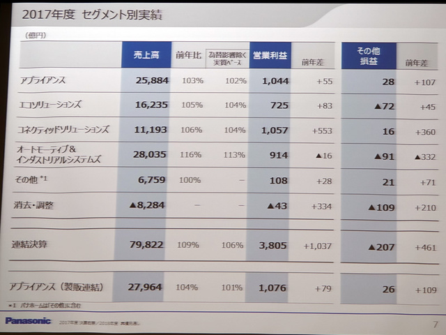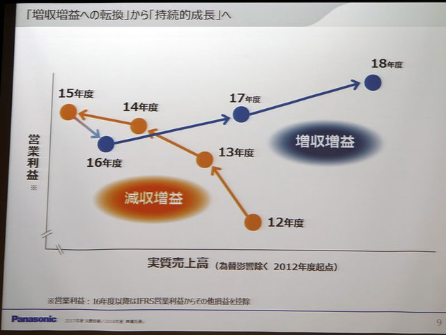 会見で各種数値の説明に当たった梅田CFOは、2012年度から続いていた「減収増益」から「増収増益」への転換を目指し各種取り組みを行い、前期の2016年度からその転換を果たしたことに言及。今回実質ベースで7年ぶりの増収増益を達成したことを受け「我々パナソニックは持続的な成長に向けて反転できた状態になった」と述べた。