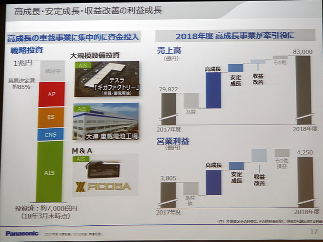 2018年度も増収増益を達成する見通し。車載電池などのエナジー、インダストリアルが増収増益の牽引役になるだろうという。そして2018年度の純損益では、2016年度に中期目標として掲げた純利益2,500億円を目指すとした。