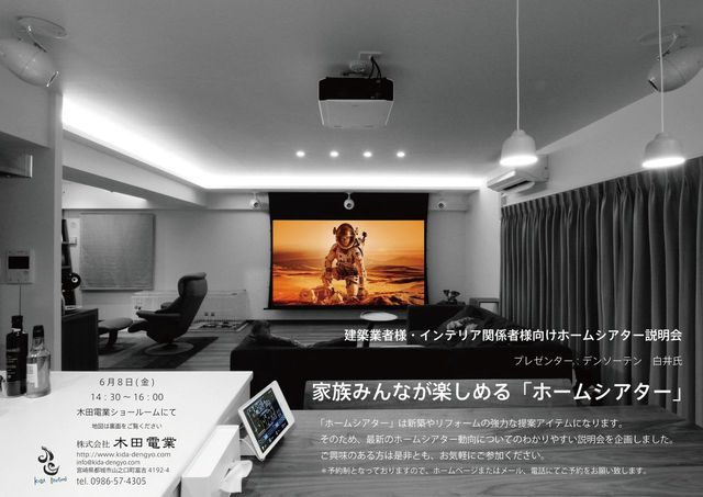また、同じく木田電業ショールームでは、6月8日(金)に「建築業者・インテリア業者向けホームシアター説明会」を開催する。会場は同社ショールーム「has...」。開催時間は14:30~16:00。プレゼンターはデンソーテンの白井雅弥氏。