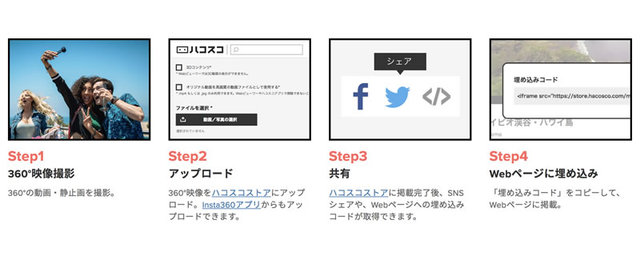 なお、今回の「ハコスコUP!」のリリースにあたり、ハコスコ社ではInsta360との技術提携を行い、Insta360 ONEやPanoClipアプリと360度映像配信プラットフォーム「ハコスコストア」の連携を実施。Insta360製品で撮影した360度映像をそれらのアプリから、直接ハコスコストアにアップロードできるようにした。
