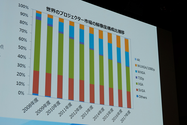 また「世界のプロジェクター市場規模推移は横ばいの状態。解像度別に見ると、高解像度モデルが数を増やしている。また4,000ルーメン以上のプロジェクターを光源別に市場規模推移を見ると、レーザー光源の需要が高まってきている」と高解像度モデル、レーザー光源モデルの需要の高まりが、今回のラインナップ拡充につながったという。