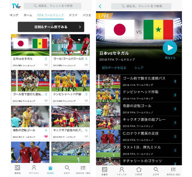 ライブ配信は6月15日のエジプト対ウルグアイ戦を皮切りに一部の試合で実施。ハイライト動画は、日別ページやチーム別ページで探すことができる。