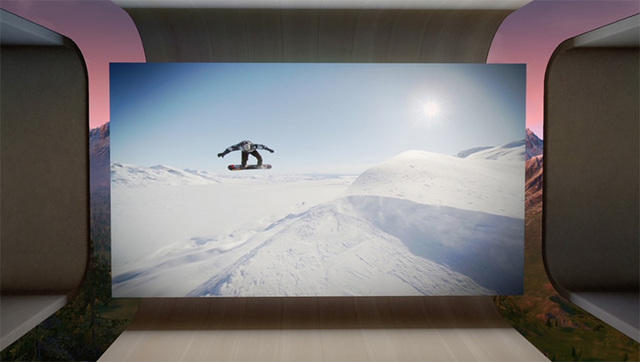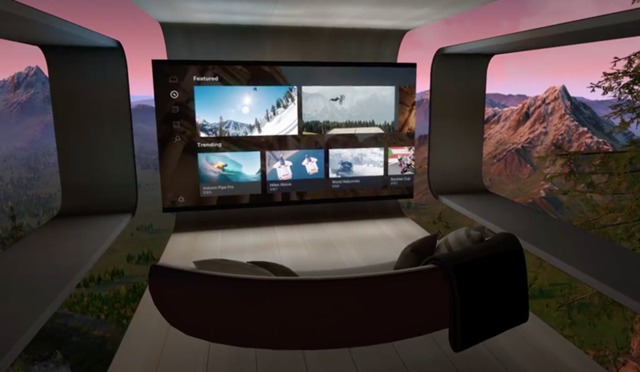 実際にアプリを起ち上げてみると、アプリを大自然の中にぽつんと浮かんだようなリビングルームにソファーが置かれており、そこから画面を見るような体験が得られる。視界前方を大きなバーチャルスクリーンが占め、プロジェクターで投写した大画面映像を見ているかのような感覚だ。