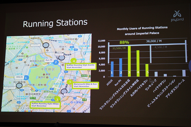 日本では2007年の東京マラソン開催以降、ランニングの人気が高まっており、皇居周辺では1日1万人以上が走る事もあるという。「一つの場所として集まっているのは世界的にも珍しく、皇居周辺はランニングステーションとして機能している場所が20以上ある」とのこと。そこでJaybirdでは、JOGLISやRunPitなど特に利用率の高い5つの施設において、パネル展開や製品貸し出しなどを行っている。
