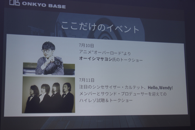 プレゼンテーションでは、ONKYO BASEでのイベント開催にも注力していくことが紹介された。直近では、7月10日(火)にはアニメ“オーバーロード”よりオーイシマサヨシ氏のトークショー、7月11日(水)には今注目のシンセサイザー・カルテット Hello, Wendy! とそのサウンド・プロデューサーを迎えてのハイレゾ試聴&トークショーが実施される。