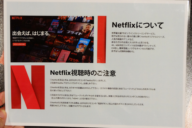 また「Netflixルーム」は、Netflixの鑑賞にのみ使用される部屋ではない。普通に歌うことも可能なので、気分が高まったらそのままカラオケに移行してもよい。カラオケへはテレビの入力切り替えをすれば済む。
