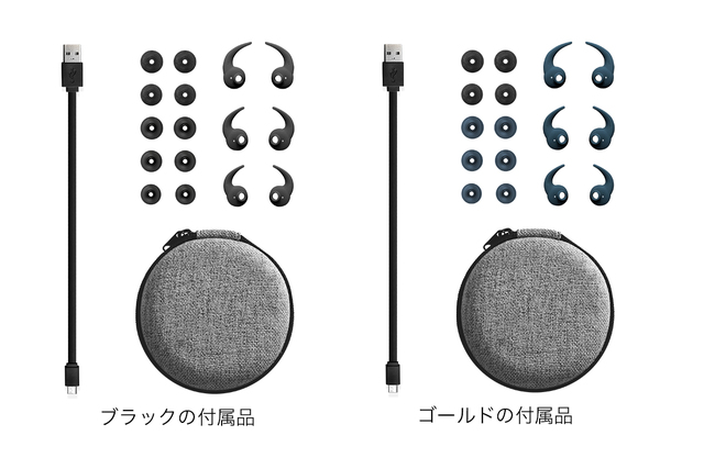 マグネット内蔵でネックレスのように首に掛けることが可能なほか、上記のようにComplyソフトフォームイヤーピースとシリコンイヤーピースが付属。ファブリック製キャリングケースなども付属する。