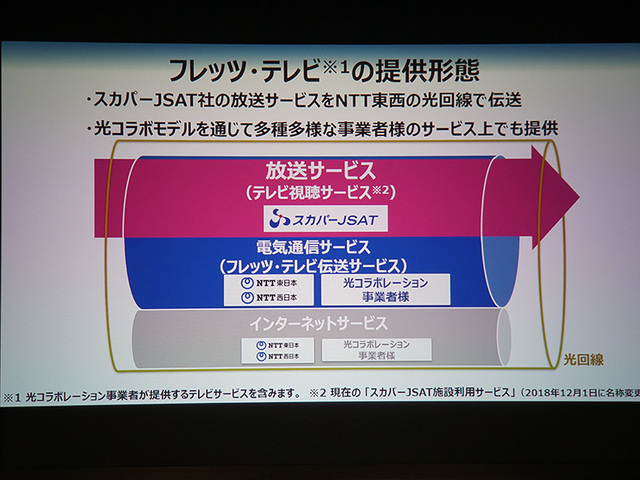 スカパーJSATおよびNTT東西は、今年12月から始まる新4K8K衛星放送を「フレッツ・テレビ」サービスを通じてアンテナ不要で視聴できるようにすると発表。従来のBS放送で使用している右旋波での4Kチャンネルは放送と同時の12月1日から、新たに使用されることになる左旋波でのチャンネルは2019年夏以降に提供開始すると発表した。