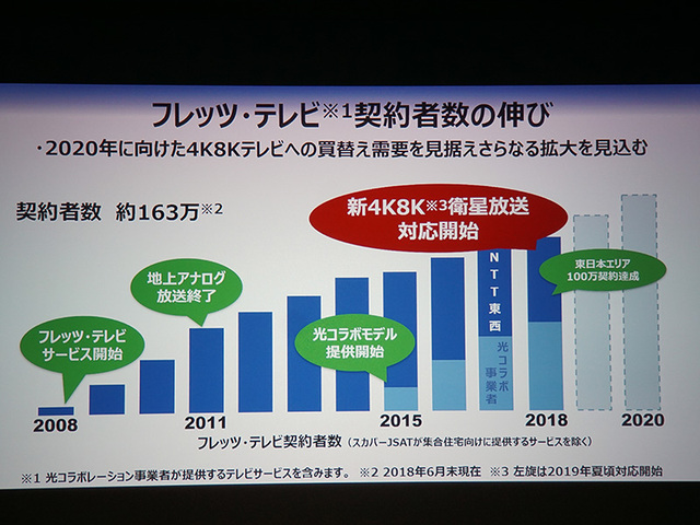 また、2008年のフレッツ・テレビサービス開始以来、2011年の地上アナログ放送停波、2015年からの光コラボ(他社への光回線卸)提供などで順調に加入者数が増え、現在は163万契約を突破していることを紹介。「(東京オリンピック・パラリンピックがある)2020年に向けて、より高精細、高画質なサービスを提供していきたい」とした。