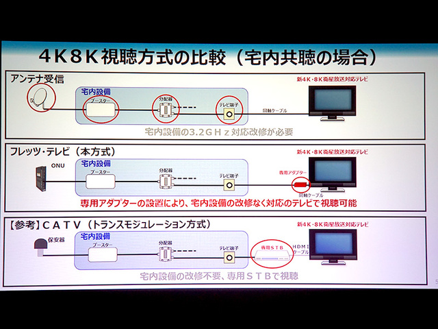 なお、専用アダプターはONU(モデム)とは別筐体。「将来的にONUに内蔵することも技術的には可能だが、そうするとフレッツ・テレビサービスが不要なお客様にも(機能向上で価格も上がる)新モデルのONUをお使い頂く必要が出てくるため、今のところ内蔵させる考えはない」という。