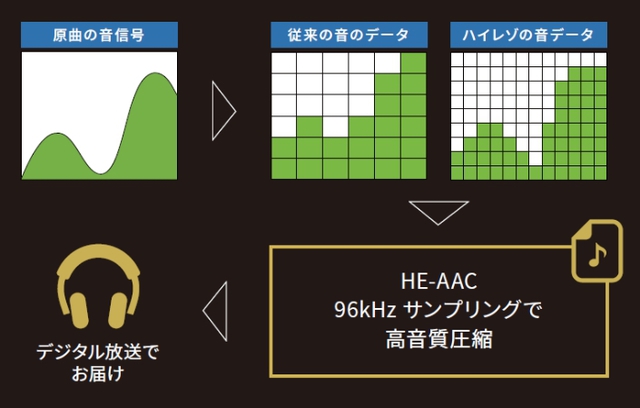 i-dioは2016年7月より全国で本格放送を順次開始している、デジタル放送サービス。リアルな再現性が特徴だがデータ量が多いため、従来のフォーマットでは放送することができなかった高解像度のハイレゾ音声データに対し、高音域を低音域から生成するSBR技術を採用することで、96kHzサンプリング HE-AACフォーマットで、ハイレゾに迫る地上波最高音質の放送を可能としたという。