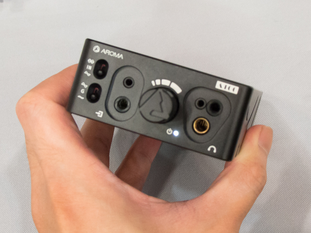また昨日のニュースリリースでも発表された(関連ニュース)、AROMAブランドのポータブルヘッドホンアンプ「A100」と、イヤホン「Musical Box Star」の試作機も出展された。「A100」はオーソドックスな3.5mmステレオミニ入出力に加え、2.5mmのバランス入出力、4.4mmのバランス出力も搭載、ポータブルオーディオ製品としては高電圧の±15Vで駆動するという製品。価格は未定だが、8月初旬には発売できるという。