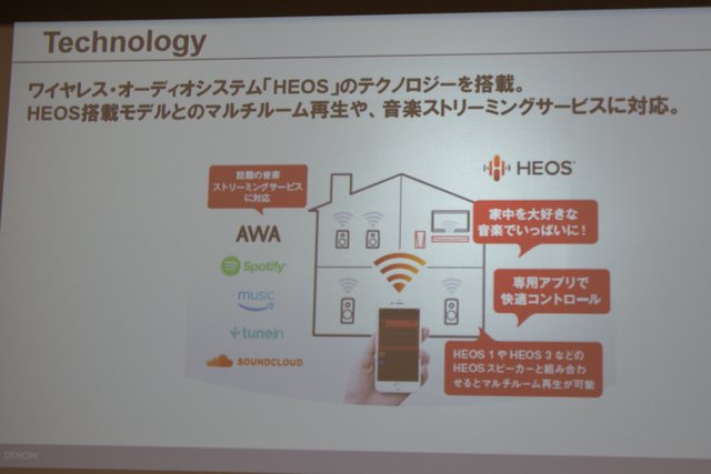 新たにデノンのネットワーク/ワイヤレスオーディオ技術「HEOS」を搭載。192kHz/24bit PCMや5.6MHz DSDのネットワーク再生、USB-A端子経由でのUSBメモリー再生が行える。また、Spotifyをはじめとする音楽ストリーミング再生にも対応する。HEOS対応機器と連動したマルチルーム再生も可能だ。本機で再生した音源をHEOS機器へ配信することもできる。