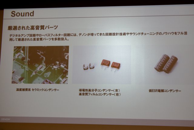 デジタルアンプの関連回路やローパスフィルター回路にも、デノンのHi-Fiコンポーネントの回路設計技術やチューニングのノウハウを活用。また、温度補償系セラミックコンデンサー、導電性高分子コンデンサーやフィルムコンデンサー、低ESR電解コンデンサーなど厳選した高音質パーツも多数投入した。