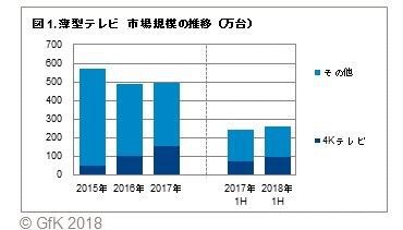 薄型テレビの販売台数は前年比7%増の260万台となった。また、6月期はワールドカップにより需要が押し上げられたこともあり、同25%増を記録している。4Kテレビは数量前年比40%増の100万台となり、薄型テレビに占める構成比は数量ベースで39%、金額ベースで69%と、いずれも前年同期から9%ポイント上昇した。