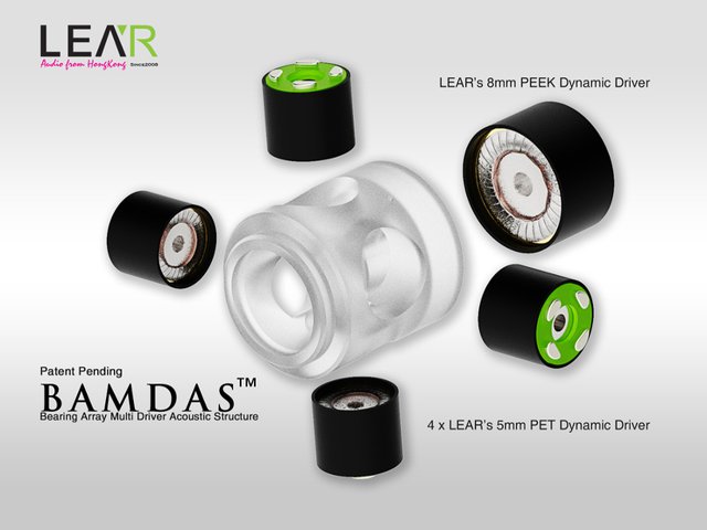 BAMDAS 5は、LEARが独自開発したイヤホン構造「BAMDAS」を採用したイヤホン。BAMDASはBearing Array Multi Driver Acoustic Structureの略で、「軸受配列マルチドライバー音響設計」を意味する。同社が過去10年間のIEM製造経験で培ったノウハウをもとに設計したものとなる。