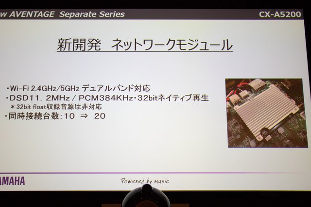 2018年の同社製品から採用されているヤマハ独自のネットワークモジュールを搭載。11.2MHz DSDや384kHz/32bit PCMのネイティブ再生にも対応する(32bit floatは非対応)。