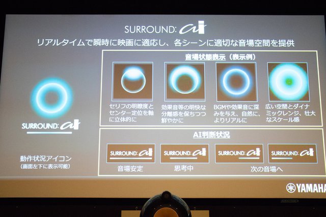 ヤマハの最新世代AVアンプのフラグシップとして、SURROUND:AIにも対応した。SURROUND:AIは、コンテンツ音声の特性をリアルタイムで判断して各シーンに最適な音場空間を提供する機能だ。先行して登場したAVENTAGEの一体型AVアンプ 3機種で初搭載された機能が、本機にも搭載された格好だ。