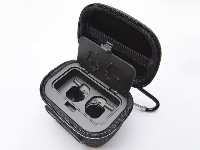 充電機能内蔵の専用ケースも耐久性を重視し、カラビナとファスナー付のセミハードケースと蓋付きハードケースの2重構造を採用。セミハードケース側には付属品を収納できるポケットも設けられている。