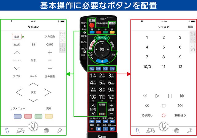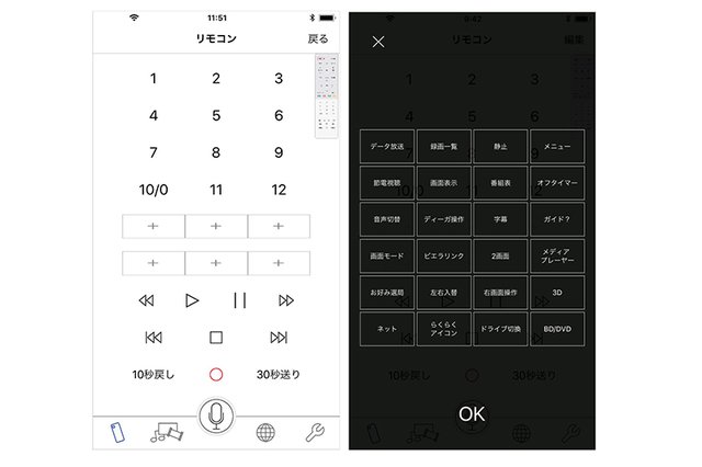 リモコン機能ではテレビの基本操作に加えて、「お部屋ジャンプリンク」などのビエラ独自機能の操作も行える。基本画面では、電源オン/オフ、チャンネル切替、音量変更、再生コンテンツの操作(早送り/早戻し/一時停止など)のボタンを装備。TV Remote2では6面あったリモコン画面を2面にまとめ、使いやすさを追求したとのこと。
