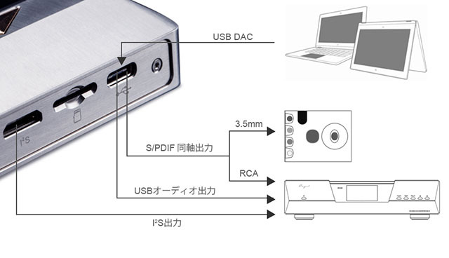 デジタル出力には、I2S(Mini HDMI)とUSB Type-C端子を搭載。USB Type-Cには端子形状を変換することでS/PDIF同軸出力にも対応できるとしており、また外部メモリーを接続して音源の読み込みや、PCなどに接続してUSB-DACとして使用することもできる。