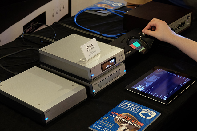 メルコシンクレッツはDELAブランドのミュージックライブラリー「N10」をトランスポートとしたシステムなどを用意。SUNSHINEは同社MMCXリケーブルを試聴できるようにブースに並べた。