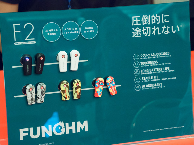 FUNOHM(ファノーム)は、クアルコムの最新ワイヤレスチップ「QCC3020」を搭載した、Bluetooth5.0対応の完全ワイヤレスイヤホン「F2」を展示していた。