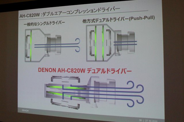 また、AH-C820およびAH-C820Wのダブル・エアーコンプレッション・ドライバーは、向かい合わせのドライバーの片側にやや角度が付けられている。これは直進性の強い中高域をより鮮度高く耳に届けるために、最適な角度にドライバーを傾けているとのことだ。