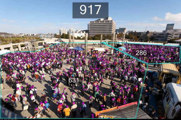 群衆人数の推定では、ネットワークカメラの映像からスタジアム内の広場や売店前などに集まった人数をリアルタイムでカウント、さらに時間帯ごとの混雑状況を解析する実験を行った。大勢の人が密集して重なっていたり、さまざまな方向を向いていたりする群衆の映像からでも、AI技術を用いることで高い精度で人数をカウントできたとした。