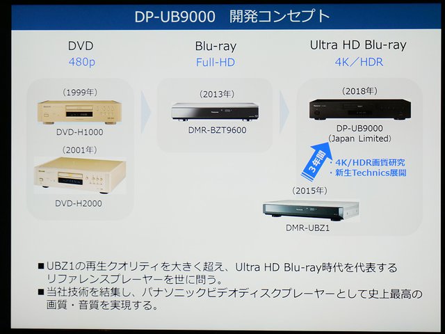 本機の概要をかんたんに紹介する。まず日本で販売される「DP-UB9000(Japan Limited)」は、ヨーロッパですでに発表されている「DP-UB9000」がベースとなっていて、モデル名が同じで、外観もほぼ同じ。しかし、内部は日本向けにさらに画質・音質を追求した、まさに「Japan Limited」(日本限定)仕様となっている。ヨーロッパ版と日本版のUB9000は「全く別のもの」(パナソニック担当者)なのだ。