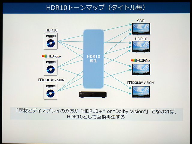 新画質エンジンを搭載したLSIによって、映像信号の処理能力が飛躍的に向上。最新のHDR規格である「HDR10+と「ドルビービジョン」に、国内のプレーヤーとして初めて両対応した。また、ディスプレイがこれらの新規格に対応していない場合でも、独自の「高精度HDRトーンマップ」技術によって、自動的に適切なHDR映像を楽しめる。