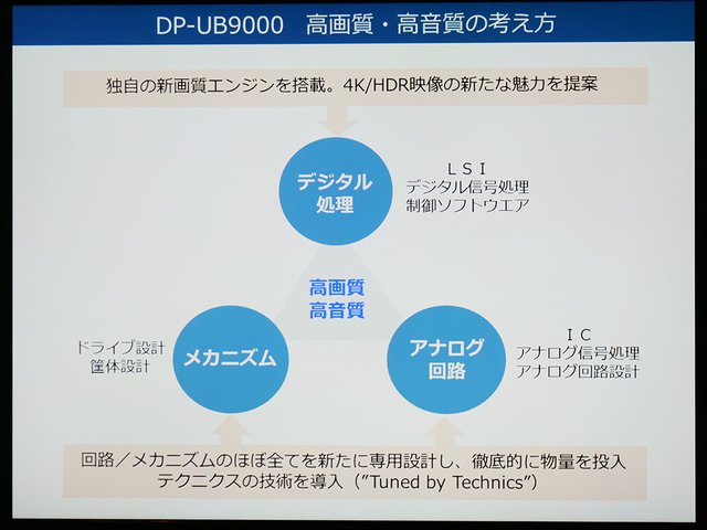 高画質と高音質を実現するための考え方として同社が重視したポイントは3つ。「デジタル処理」「メカニズム」「アナログ回路」だ。「デジタル処理」については、独自の新画質エンジンを搭載し、HDR表現をさらに高めた。また「メカニズム」「アナログ回路」においては、回路やメカのほぼ全てを新たに専用設計。徹底的に物量を投入したほか、前述のようにTechnicsの技術を導入したことにより、特に音質面でヨーロッパ版とはかなり異なる仕様となっている。
