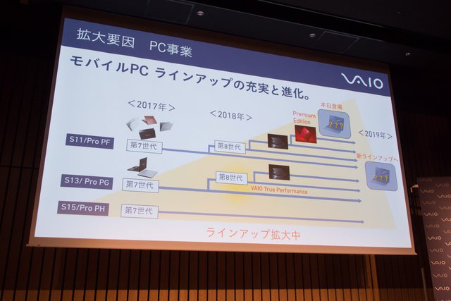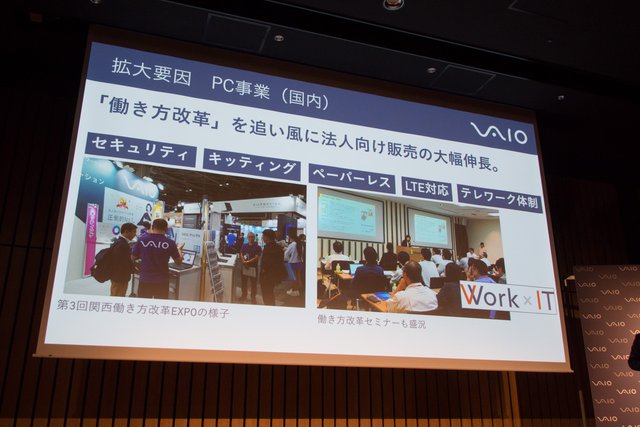まずPC事業では、モバイル製品のラインナップ拡充、法人向け販売の大幅な伸長を挙げた。ラインナップに関しては、今年に入り同社独自の機能を搭載したモデルや、往年のVAIO製品を想起させる仕上げの限定モデルなどを続けて発表した事が大きいとし、来年初頭にも新たな製品を展開するなどラインナップ拡充を継続していくとした。