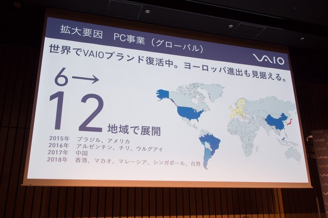 また吉田氏は、今年に入り香港/マカオ/マレーシア/シンガポール/台湾の5地域に進出するなど、海外展開の本格化についても触れた。現時点で世界12地域でVAIOブランドを展開し、今後ヨーロッパやロシア、中近東、インドなどへの進出も検討中とした。