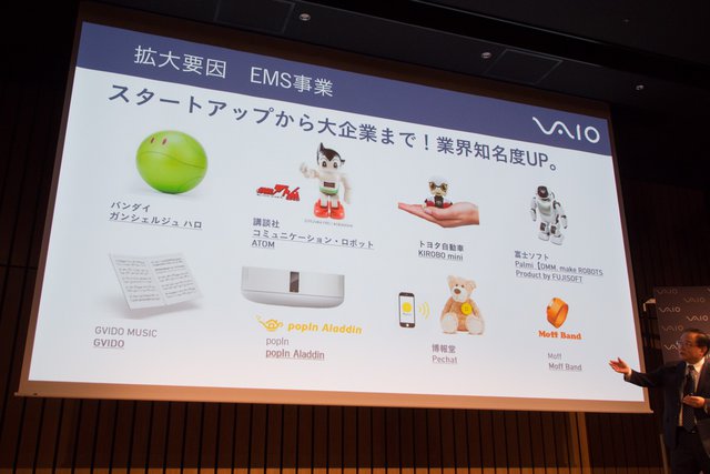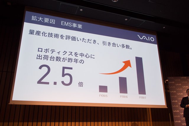 次にEMS事業では、ロボティクス製品生産の受注拡大を成長要因として挙げた。吉田氏は「製品量産化のノウハウは同社の強みのひとつ」とし、開発能力は充分だが量産能力に欠けることが多いロボティクスメーカー各社にそれを提供。2016年から2017年にかけ、生産受託製品の出荷台数は約2.5倍に増加するまでに至ったという。