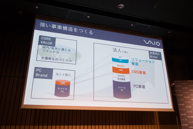 吉田氏は以上を踏まえた上で、「ソニーから独立した後の、VAIO復活シナリオの “フェーズ1” は完遂した」と宣言。続けて、VAIOの事業構造を強化し、PC/EMS/ソリューション事業が強く結びついた “次世代ITブランド” へと成長させる “フェーズ2” に向け、可及的速やかに準備を整えていくと述べた。