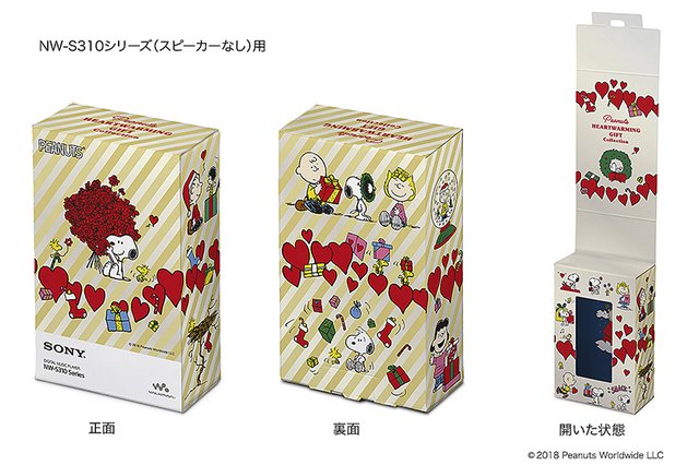 『PEANUTS Heartwarming Gift Collection』は、漫画「ピーナッツ」に登場するスヌーピーと仲間たちを描いた5種類のデザイン(プレゼントA/プレゼントB/花束/ハート/キス)から、好きなデザインを選択・本体背面に刻印できる。Memorial Gift Collectionと同じく、ウォークマンSシリーズをベースに、4GB/16GBモデルのウォークマン単体/スピーカー付きモデルを用意、4GBはブラック/ブルー/ライトピンクの3色、16GBモデルはビビットピンク/ホワイトを加えて合計5色展開となる。好きなメッセージの刻印も可能で、オリジナルパッケージを用意する。