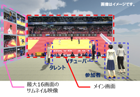 VR空間内では、正面側の巨大ディスプレイで試合を配信。同時に側面のディスプレイで会場内の4つの試合場や練習場などのさまざまな地点や角度から撮影した映像を、最大16画面のサムネイル画像で配信する。