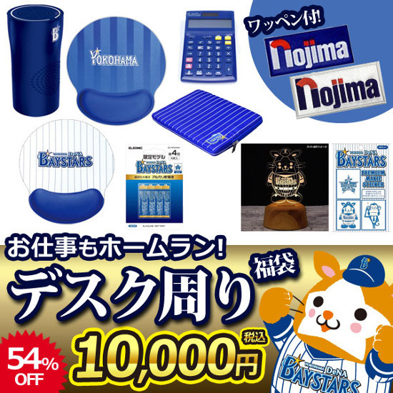 コンパクト空気清浄機、クッション付きマウスパット(横浜ブルーホーム)、クッション付きマウスパット(YOKOHAMA)、「nojima」ロゴワッペン(ホーム)、「nojima」ロゴワッペン(ビジター)、PCケース、ブルーメタリック電卓、アクリルアクセサリースタンド、アルカリ乾電池単4型、蒔絵シールセット