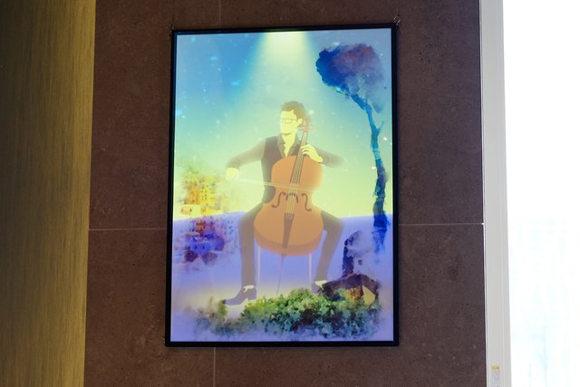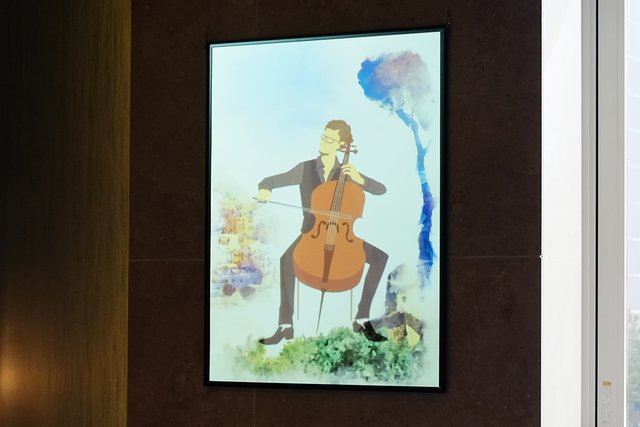 またプロジェクションマッピングからイメージされるような大がかりなものではなく、スポットで映像演出が行えることもポイントだ。今回の投写内容は背景イラストだけがプリントされたA2サイズの額縁が壁面5箇所に飾られており、そこに楽器を持った人物を映し出すというもの。音楽に合わせて、楽器を演奏するアニメーションが表示され、食事を楽しむための場所に合った雰囲気を演出してくれる。